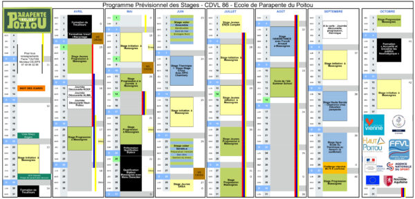 L’école de parapente du Poitou est portée par le CDVL86 et animé par un Moniteur Diplômé d’Etat. L’école est ouverte d’avril à octobre et propose des journées découverte, des stages d’apprentissage et des stages itinérants.